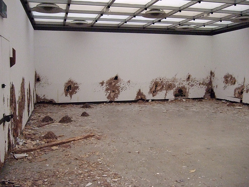 MN: Yeah. The sense of the place as a private place, an invitation only space with a buzzer on the door, and as a public space with turnstiles was very different, so I left them out. It seemed more fake in a way. It was reiterating the sense of spectacle too much but as a part of the pile of junk out the back, you’ve got this half frame wall and a pile of junk, it seemed more apt. I wanted to suggest that the work wasn’t quite finished, that there was still more to come.