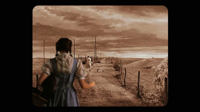 Playing across two screens, After the Rainbow reflexively acknowledges its own creation through the use of manipulated footage. Although seamless in its joining of the source films, the video is marked by abrupt jump cuts and, in a sequence where Dorothy/Garland moves backwards into the house, both image and music are simply reversed. Other visual effects are more complex but brilliantly effective. In the sequence where Dorothy and Toto rush back to the family home, the hurricane/time portal bearing down, the sky is rent apart by the dissolution of the very stuff of its creation—celluloid burns out like a psychedelic supernova. Later, when Dorothy/Garland meets her adult self, a more subtle moment is played out by the cross fading of images of both adult and child, before fading to black.