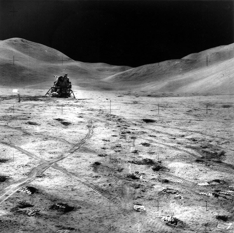 Images: Top: Chesley Bonestell, Exploring the Moon by Earthlight, from Man on The Moon, 1961. Oil on board, 36x38cms. Bottom: The Apollo 15 lunar module “Falcon” with the moon’s Apennine Mountain Range in the background.