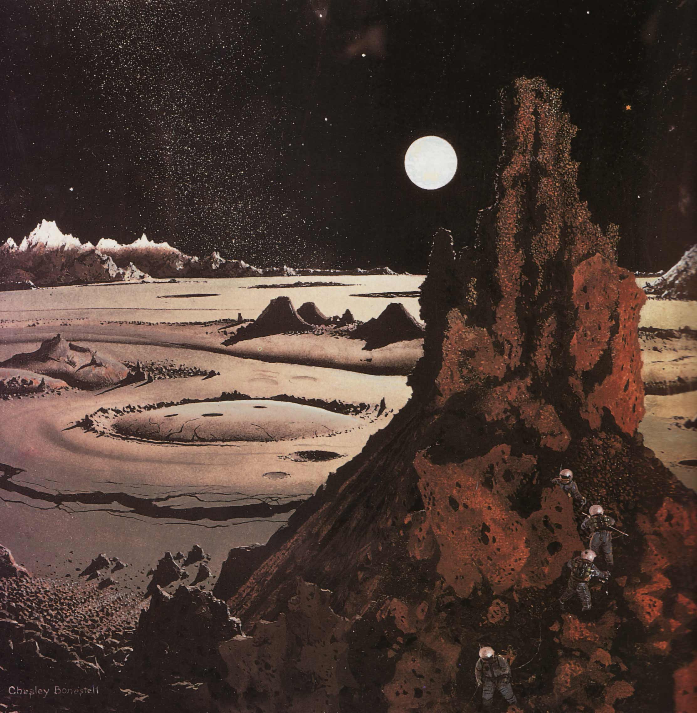 “By the mid-1960s, NASA’s Surveyor and Lunar Orbiter spacecraft had provided close-up views of the lunar surface. The photographs revealed a landscape that was far removed from the craggy scenes [Chesley] Bonestell had been painting for decades. The moon was softer, with rolling hills and mountains that appeared more Appalachian than Alpine. ‘The Moon looks for all the world like the Berkeley hills,’ Bonestell grumbled: