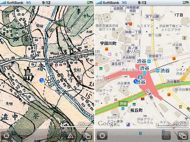 Image: Tokyo time travel map for iPhone, Cycling Tourism, Japan & Asia. “Tokyo time travel map for iPhone was released last month. This application has former editions of maps of Tokyo going back every 20 years. Because it links with GPS, I can see the old map in the present location. Shibuya was a farm village, and there was a waterwheel in the river beside me.”