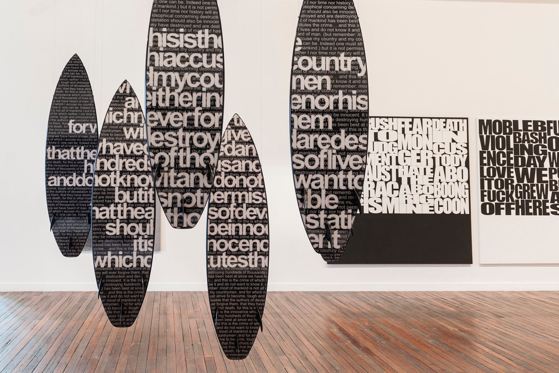 One of Ah Kee’s more provocative works is Authors of Devastation (2016), an installation of the artist’s custom painted surfboards that feature rainforest shield designs on one side, and on the other, fragments of text from the US civil rights campaign. The play between the iconic shapes of both Aussie beach life and Indigenous warriors make for a provocative mix, one that is both enticing for the boards’ design and colour, but also for the clash of cultures.