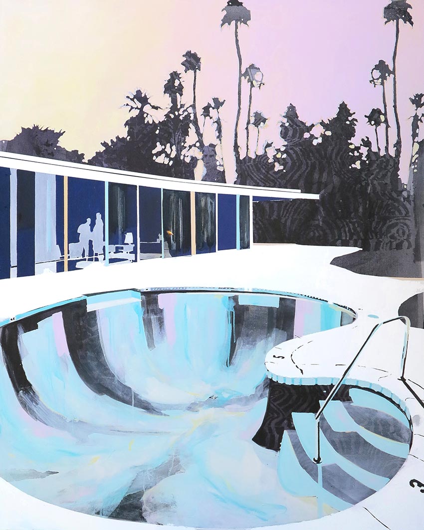 A magazine image of Davies’ work hanging on the clean white walls of Sothern Californian houses produces a strange kind of doubling. Davies’ recent paintings of houses explore the modular quality of classic modernist architecture, which, to the untrained eye, looks completely generic; buildings constructed from rectangles and squares, contained by metal beams, with generous floor-to-ceiling windows, cantilevered roofs, palette-shaped swimming pools, with obligatory diving boards, and of course, palm trees, lots of palm trees. It’s a dream of Californian cool, and even if there are many such dreams, with many such features, all very similar to each other – no matter – that does not make them any less desirable.