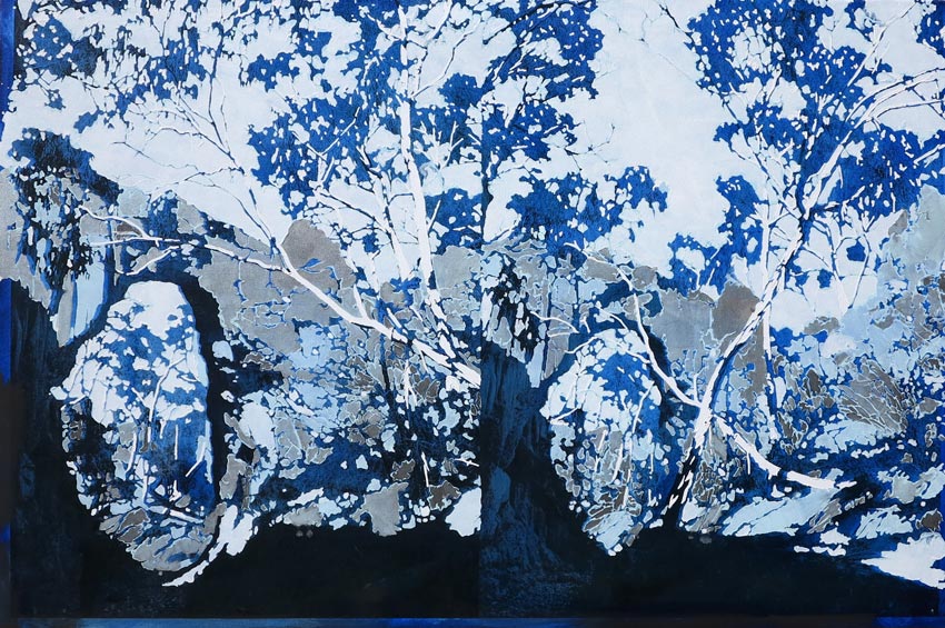 Paul Davies’ works are visually stunning: the eye is irresistibly drawn to their intricate surfaces. His paintings are created from a process involving a highly detailed collage of elements, starting with painted or photographic surfaces, overlaid by stencilled forms, which together create the final image. His works on paper are derived in part from a photographic process of exposing light sensitive emulsion on paper to light. Other works that record the process behind the creation of the paintings are likewise a sum of their constituent parts. The sculptures that feature the forms of trees and the architectural shapes of houses, are as much defined by what is not there, as what is.