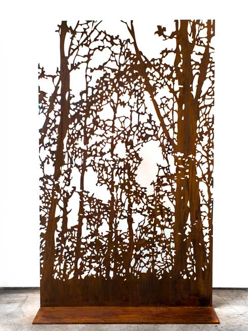 The absence of material is at the heart of Davies’ sculptures. Like many of his other works, the free-standing sculptures were created by first creating a stencil based on a photograph, one being the outline of tree trunks and branches, and the other a perspective shot of a modernist building. These works stand upright and create their ‘image’ from absences, in the case of Digital vs. Analogue [2013] the voids between the corten steel correlating with the space around the solid form of tree. And in an interesting connection, when the sculptures are placed outside, the slow play of light across them as the day progresses produces another images on the ground and walls – the shadowy image of the solid form.